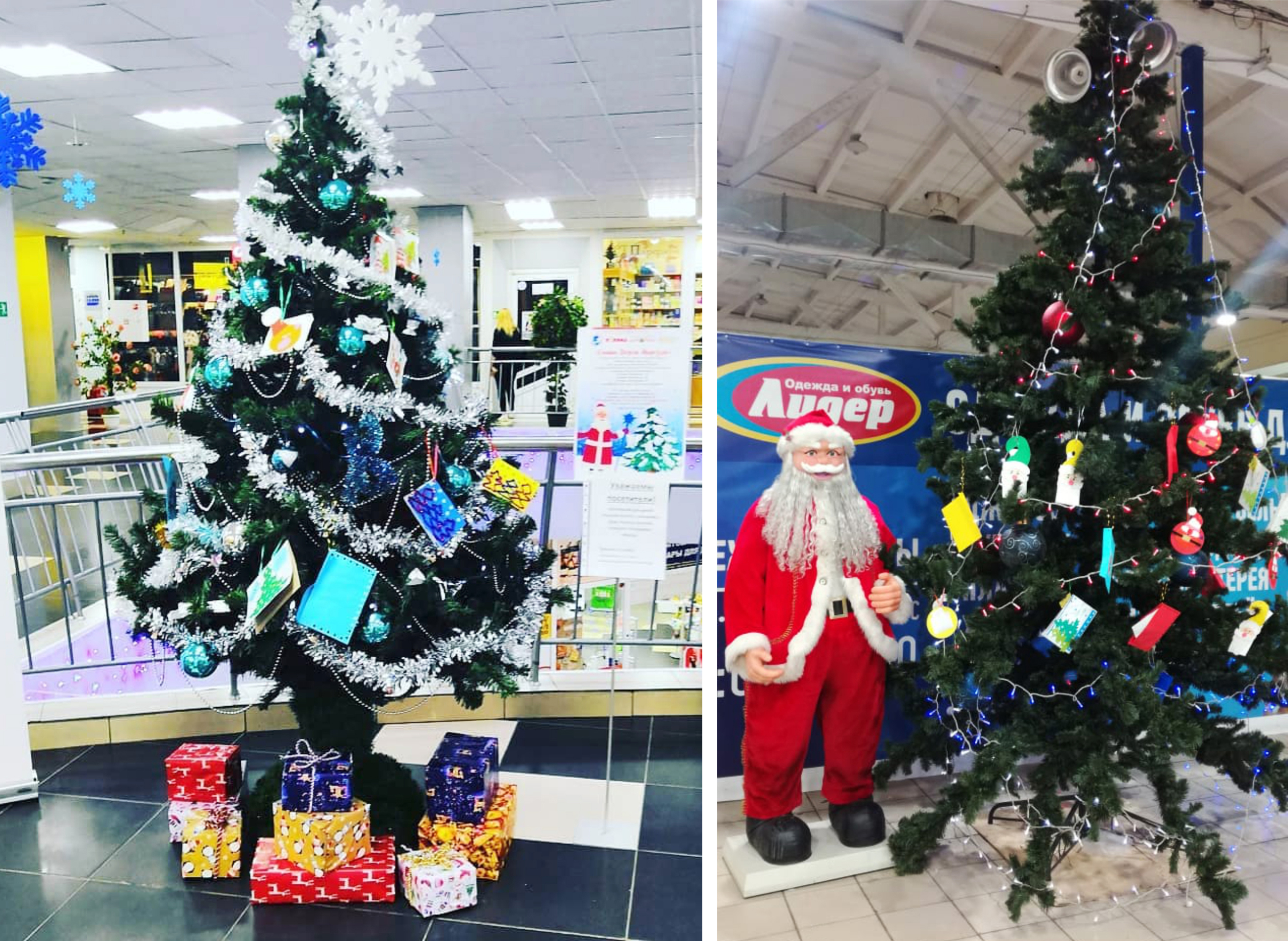Елки, украшенные пожеланиями ребятишек из коррекционной школы-интерната, установлены в торговых центрах города Кемерово - "Спутник" (ул. Терешковой, 22), "Поляна" (ул. Тухачевского, 50/4), "Октябрь" (пр. Октябрьский, 56) и Кемеровской области "Калина" (Топки, мкрн Солнечный 11а), "Спутник" (Юрга, ул. Машиностроителей, 32), а также "Парк Чудес" (Зал игровых автоматов).